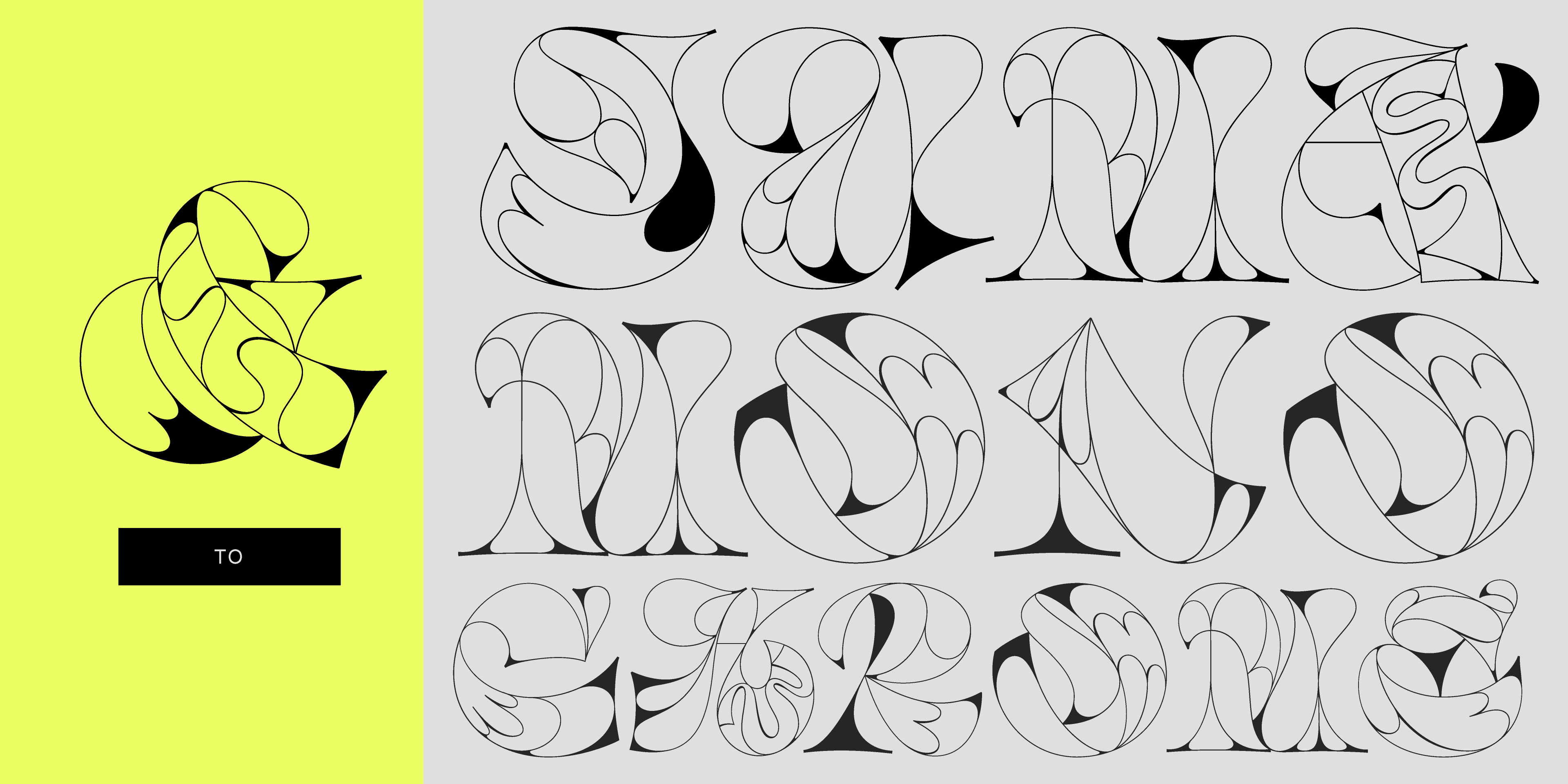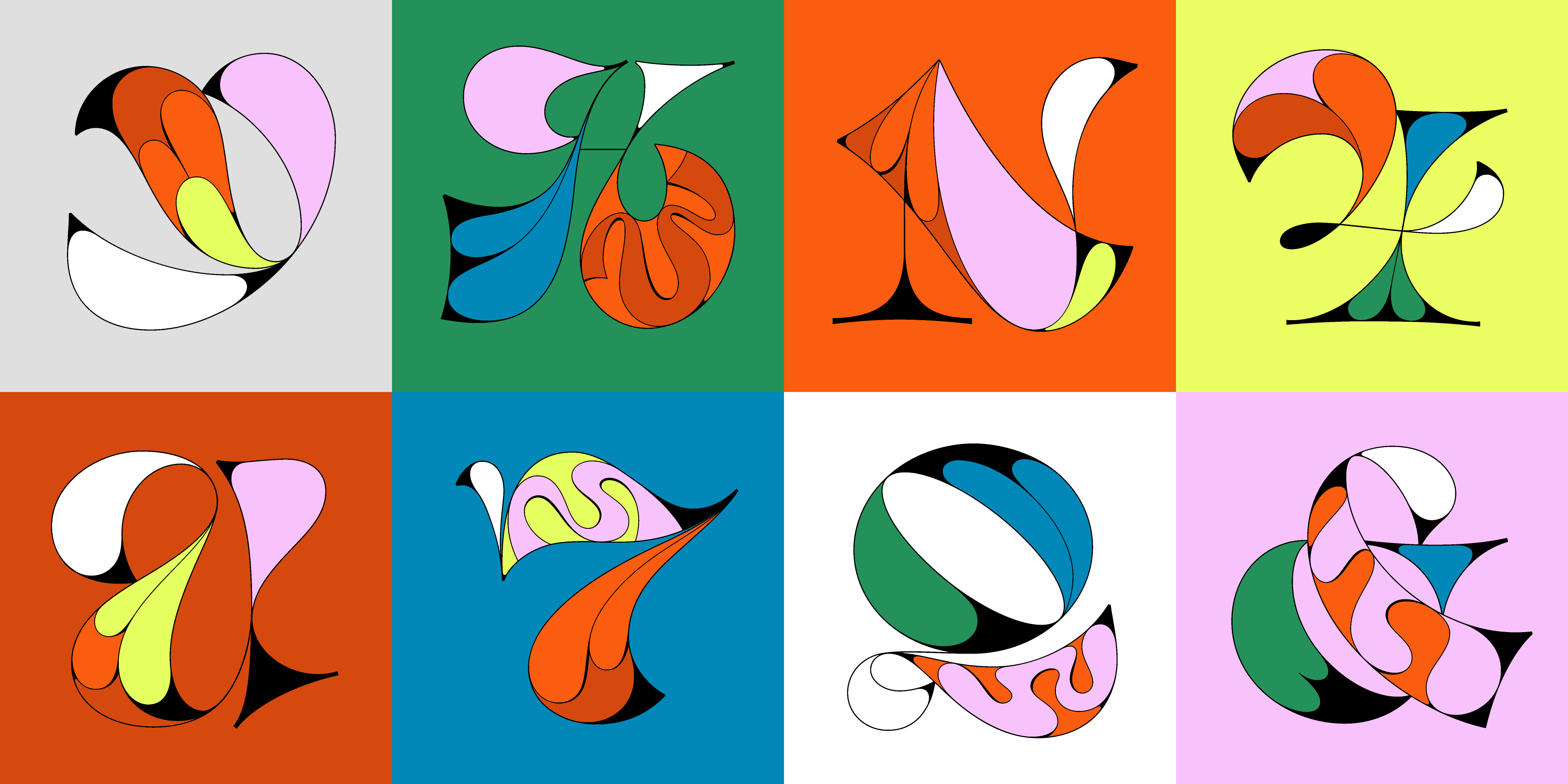 The shapes and colors of Juma remind us of natural beauties like tropical birds or a slab of marble, its twists and turns almost hypnotic. On the page, Juma can work as a beautifully decorated drop cap, a striking headline, or even in abstract compositions like patterns, but outside the page into the physical world, each individual letter has a sculptural quality to it that invites us to imagine it as an object.